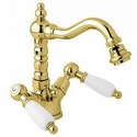 Назначение: для биде • Конструкция: двухрычажный • Монтаж: горизонтальный • Материал: латунь, покрытие - золото • Монтажные отверстия: 1 отверстие • Форма излива: традиционная • Душевая лейка в комплекте: нет • Аэратор: есть • Донный клапан в комплекте: есть