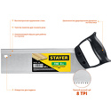Ножовка для стусла c обушком пила Stayer "Fine" 300 мм, 8 TPI, прямой закаленный зуб, точный рез, 1536-30_z01 имеет значительную ширину полотна, что упрощает прямой рез без увода в сторону. Рукоять чуть приподнята, что позволяет разделять деревянные заготовки без повреждения поверхности от ударов. . Назначение: по дереву . Количество режущих полотен: 1 . Материал режущего полотна: многокомпонентная сталь . Длина режущего полотна: 300 мм. Зубья: 2d . TPI (кол-во зубьев на дюйм): 8 .